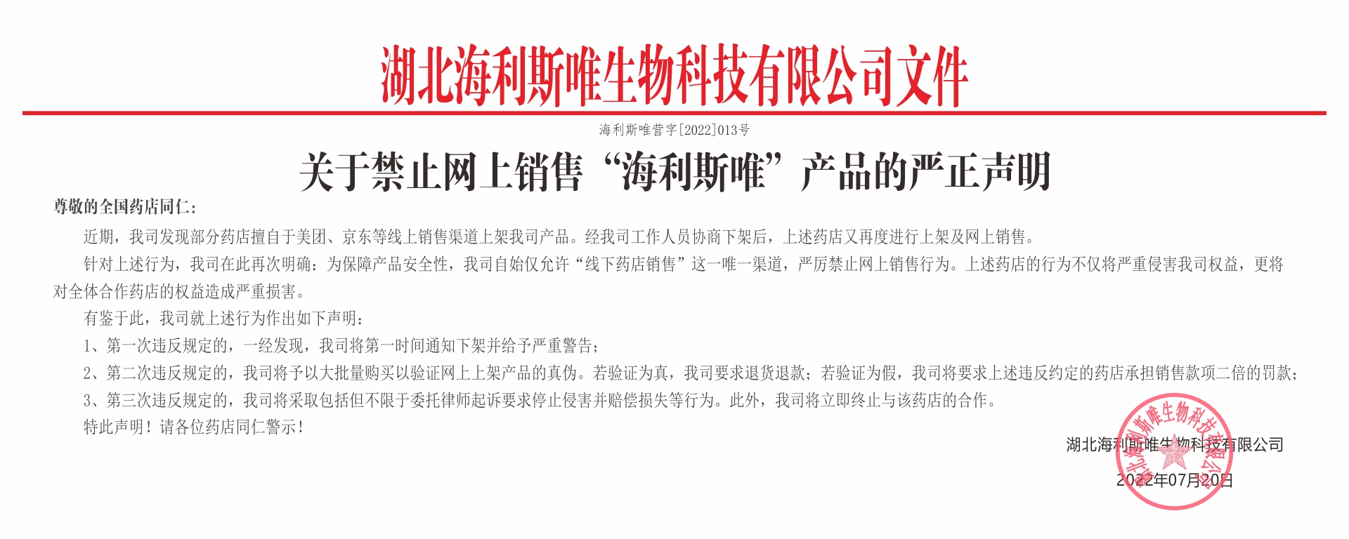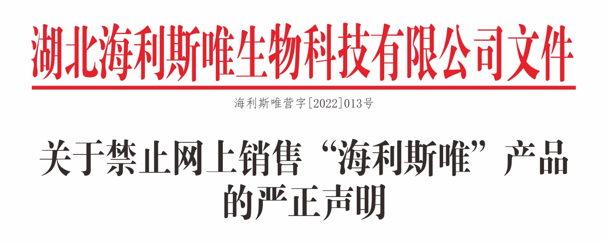 關(guān)于禁止網(wǎng)上銷售"海利斯唯"產(chǎn)品的嚴正聲明